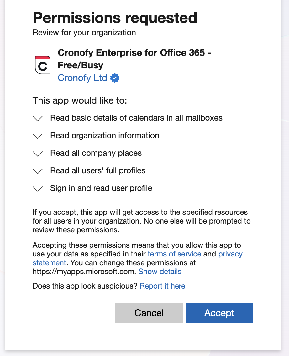 Free/Busy Access mode currently requires the following scopes to be approved within your tenant: