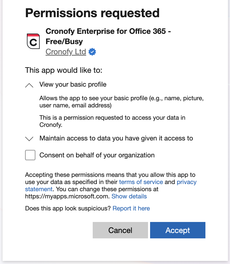 You’ll see this screen twice: first to confirm your Office 365 tenancy and then to request the necessary scopes for Enterprise Connect: