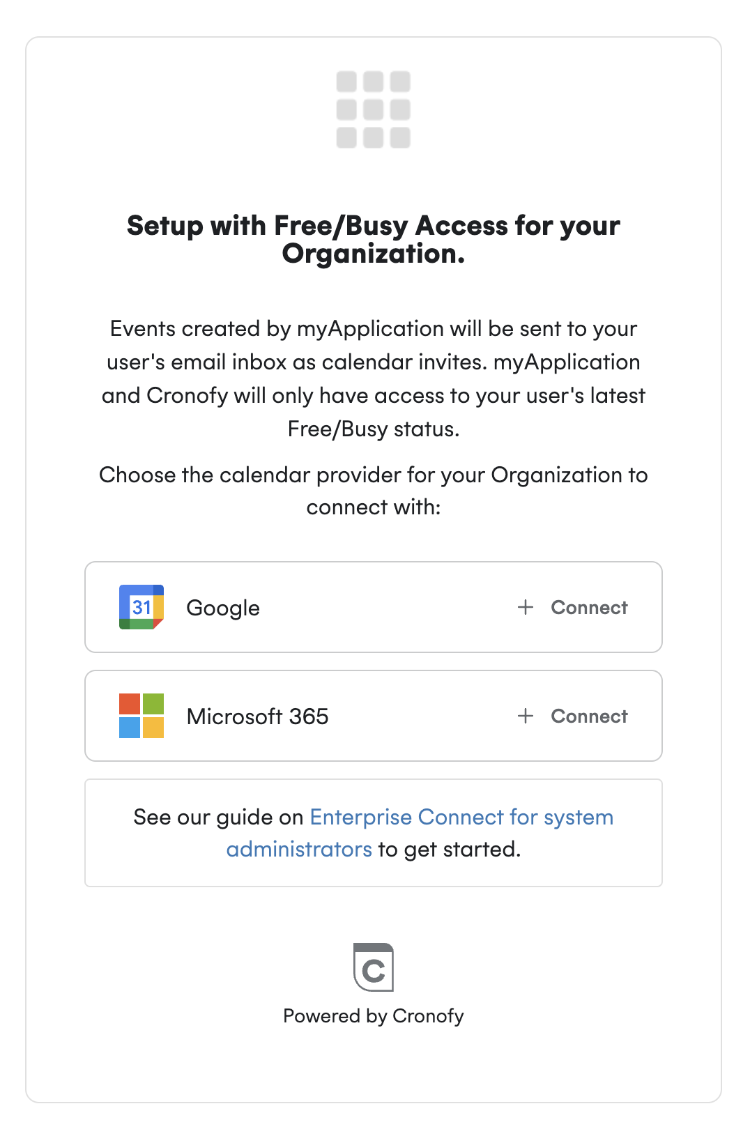 The steps to connect your organizations calendar follows similar authorization flow to the steps found here but but you will be provided with a different screen instead where you will need to select Free/Busy: