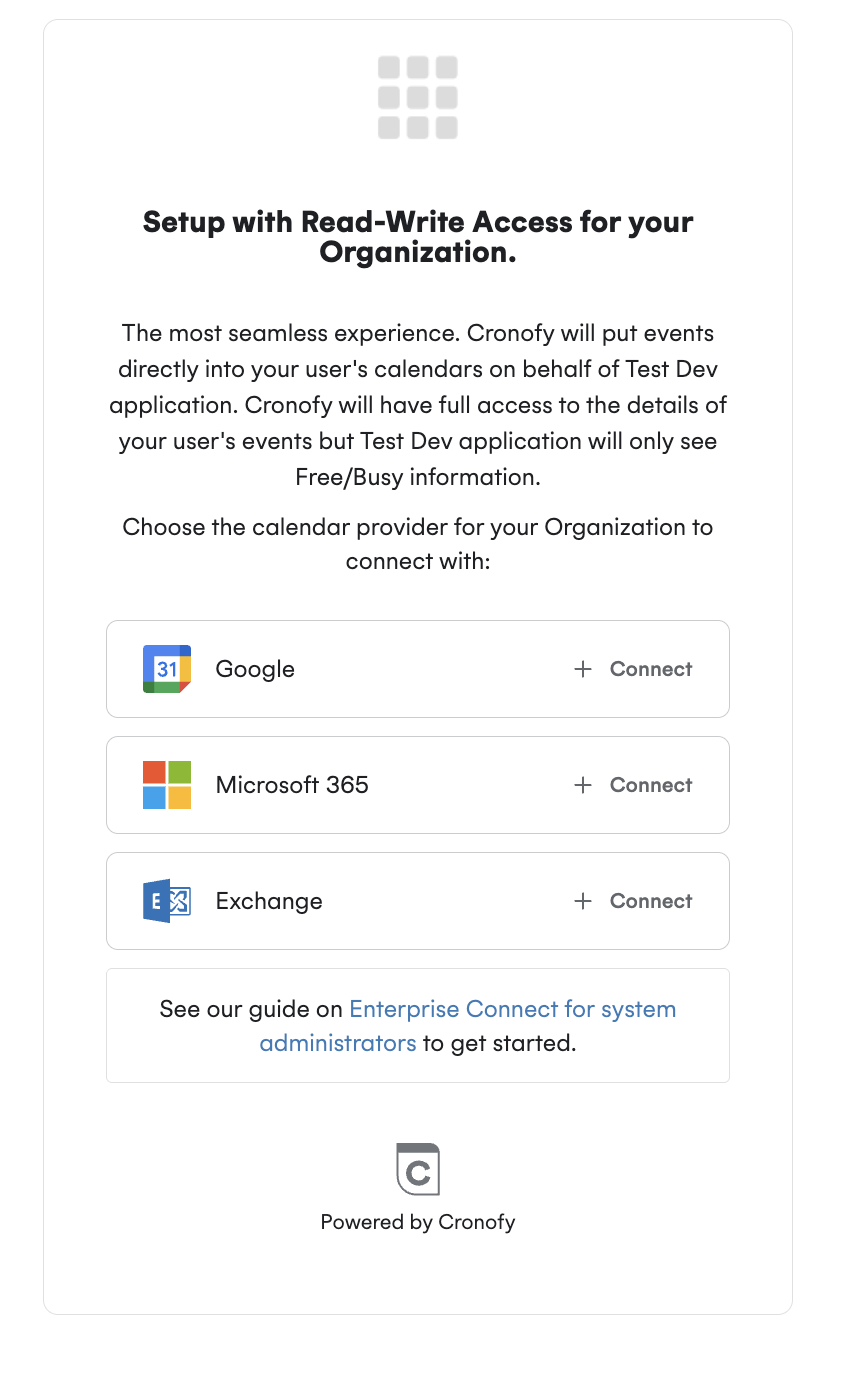 Calendar Access Modes allow customers to choose a different permission model for how Cronofy connects to their calendars in one of three modes.