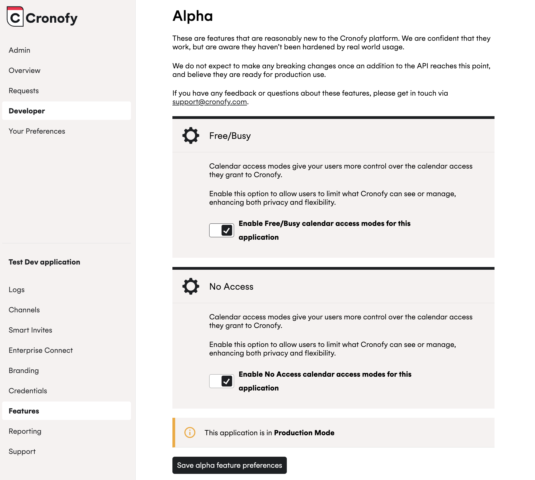 Visit the Features section for your application in the Cronofy developer dashboard to toggle on the options to offer Free/Busy and No Calendar Access to your customers:
