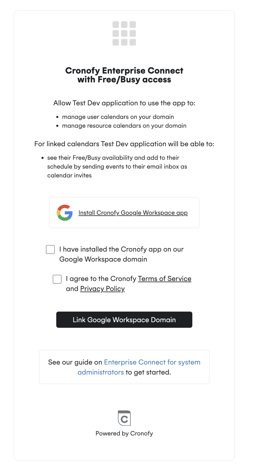 Visit the Features section for your application in the Cronofy developer dashboard to toggle on the options to offer Free/Busy and No Calendar Access to your customers: